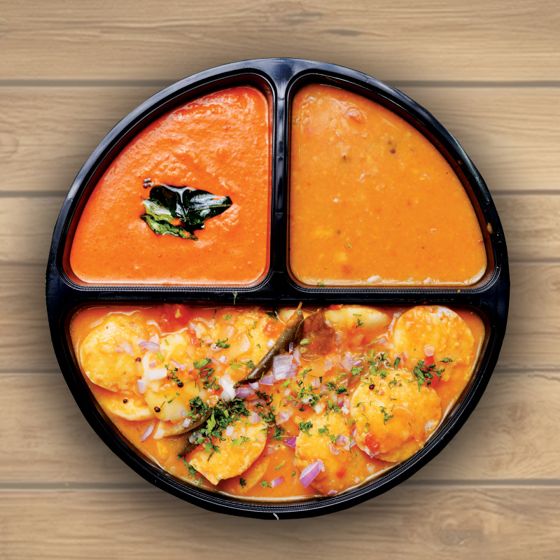 30 mini idlis (100gm) soaked in 250gm of Moong Dal Sambar, topped with freshly cut coriander and onions, and 1 chutney.